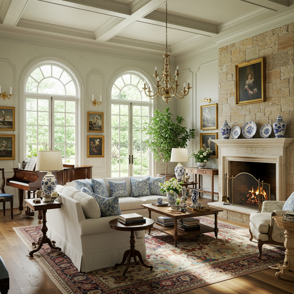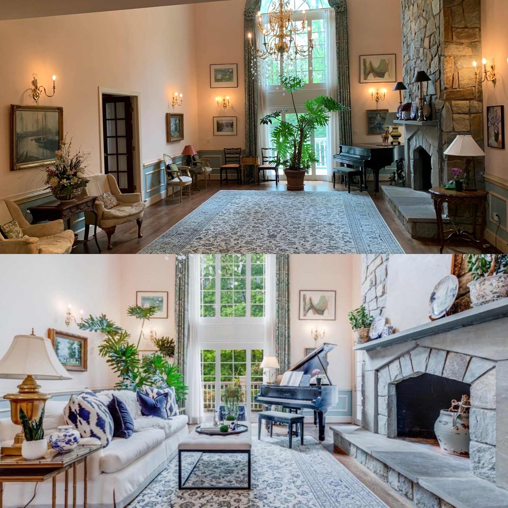 In this Clifton estate home, we used many of the owner's beautiful antiques and furniture - But as you can see, we re-arranged the couch, added pillows to couch, removed items to "lighten" the feel, we added a blue bench from our inventory and accessories to soften the vibe.
