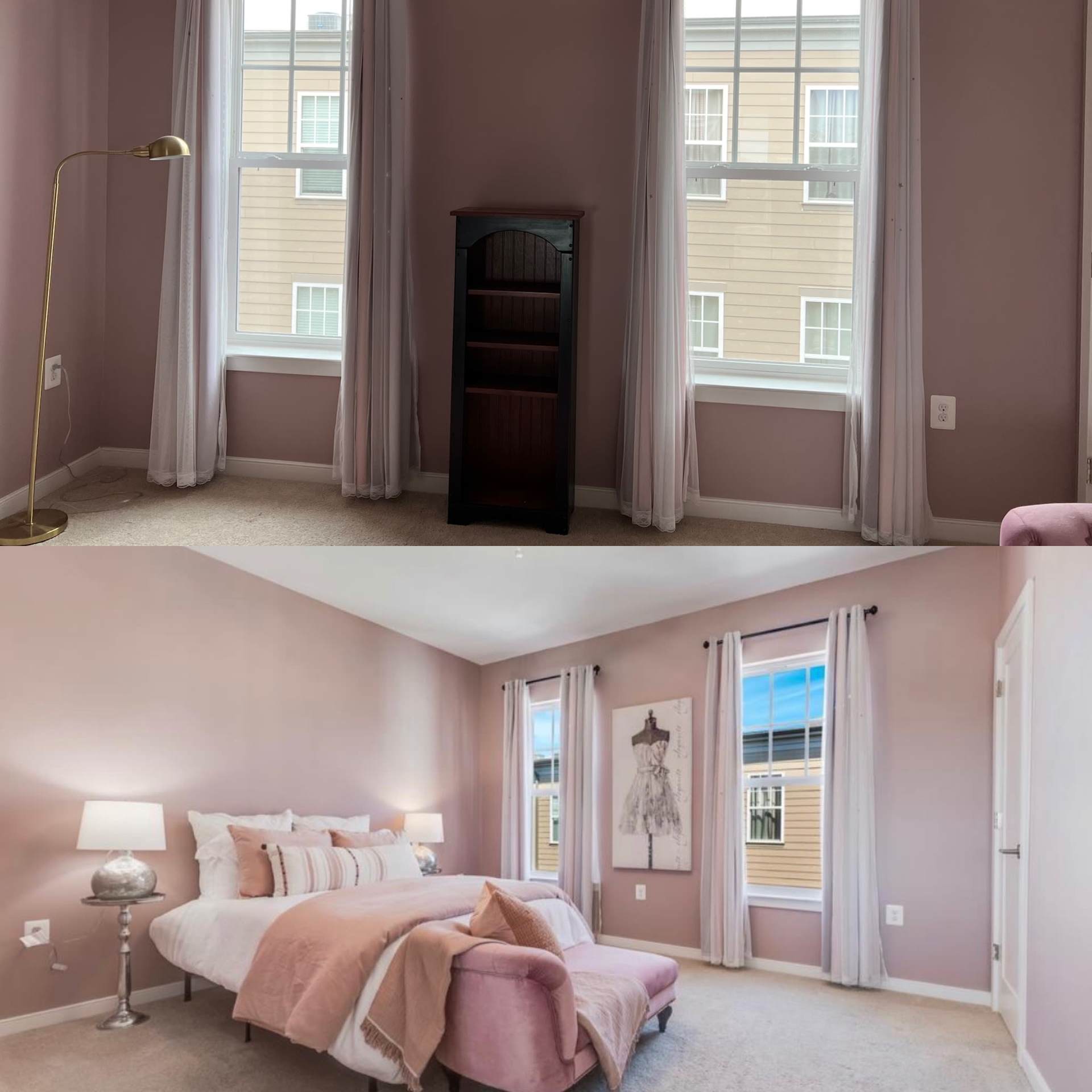 In this Leesburg townhouse bedroom, we "leaned into" the pink! We added a bed, lots of pillows, tables, lamps and artwork from our inventory.