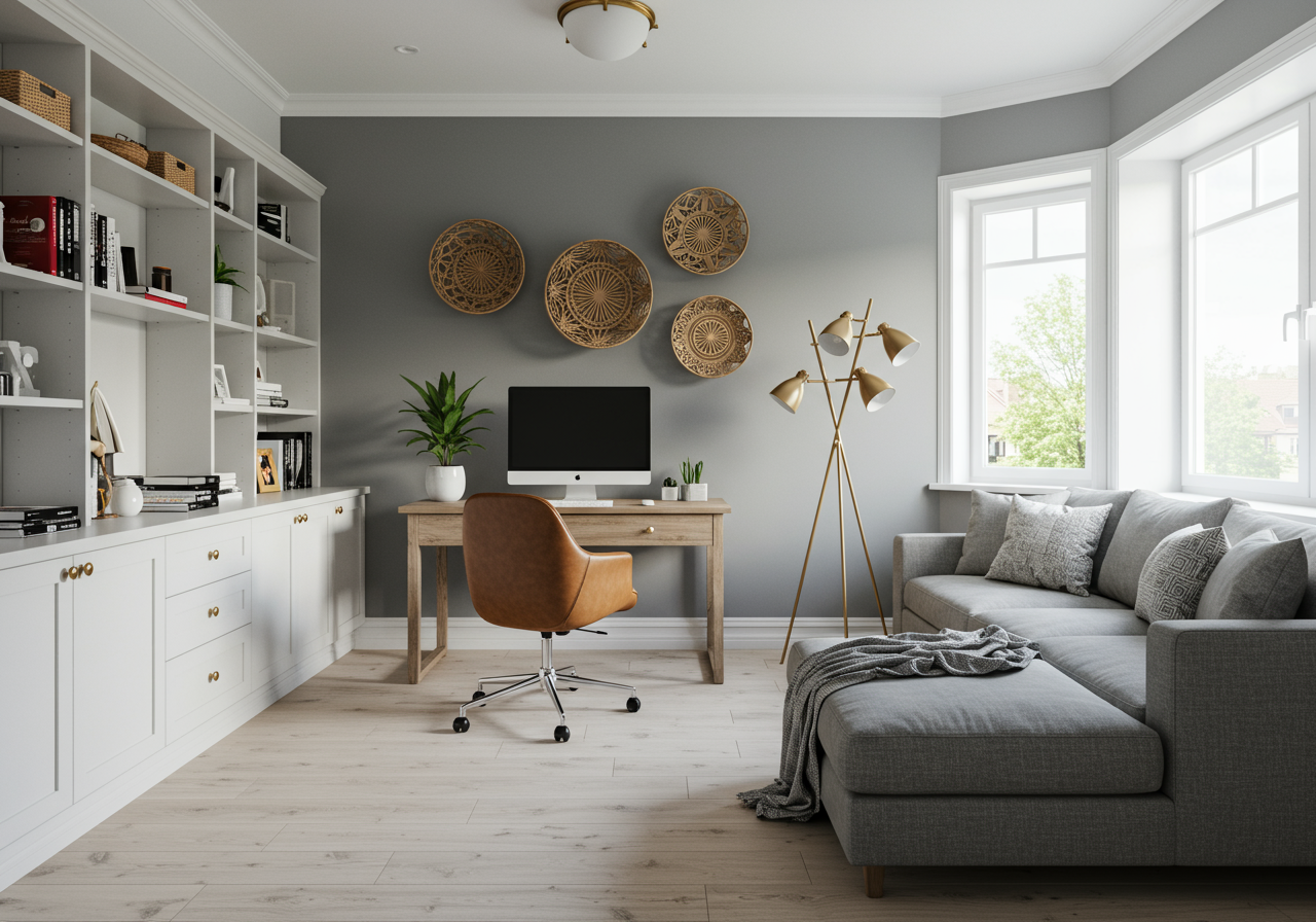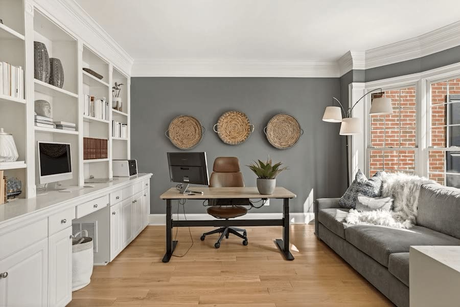 In the study, we added the baskets on the wall, the plant, the throw pillows and throw from our staging inventory, we re-arranged the homeowner's furniture, and we edited the items on the bookcases and flipped the spines of the books inward.
