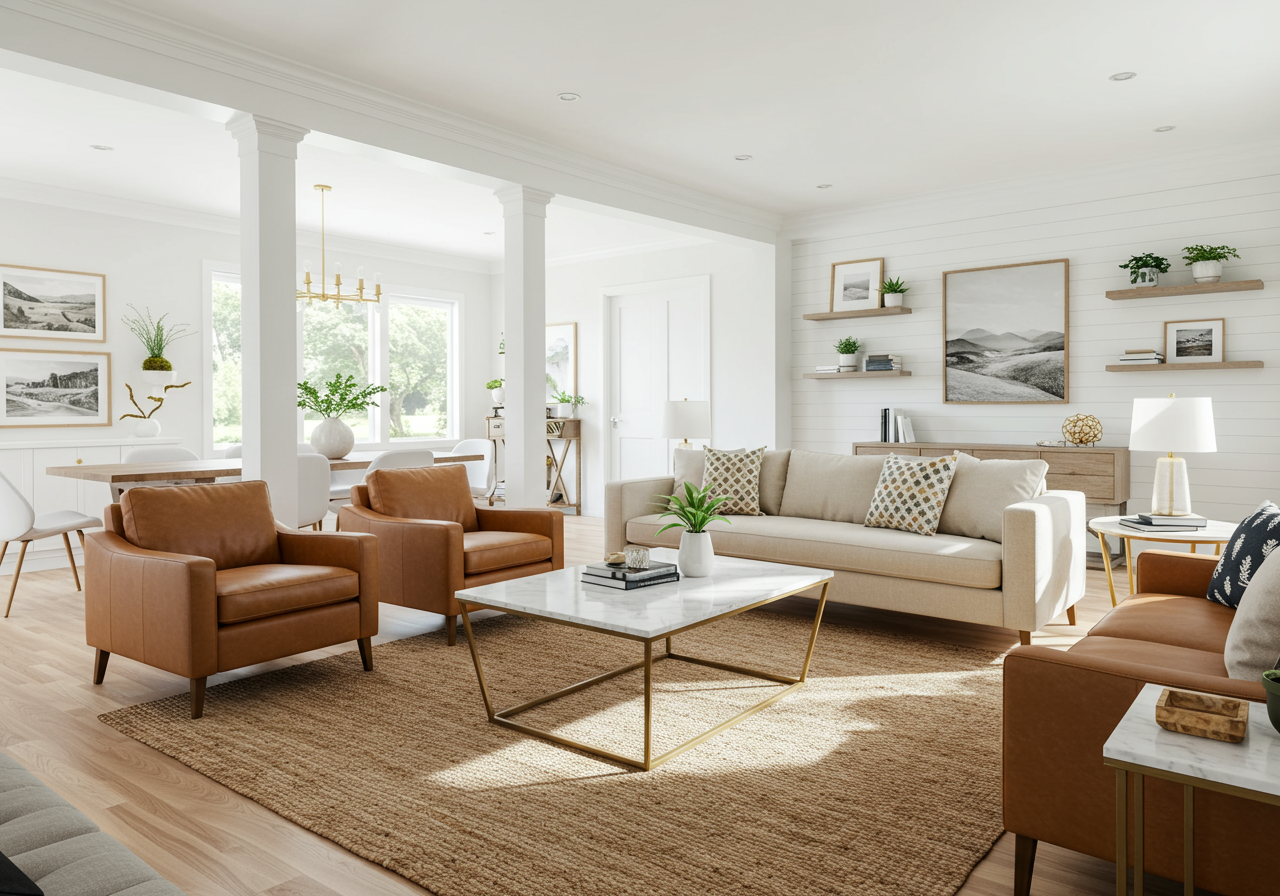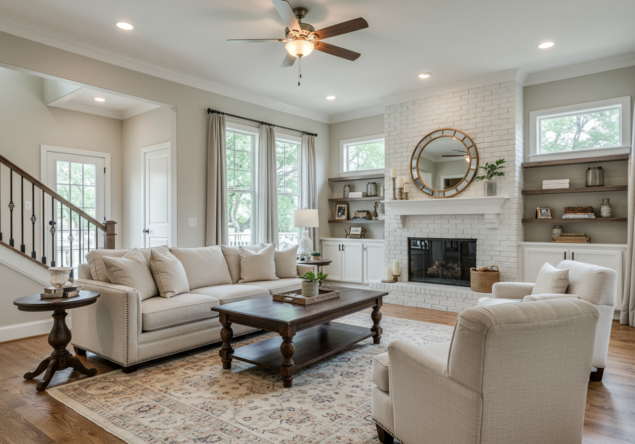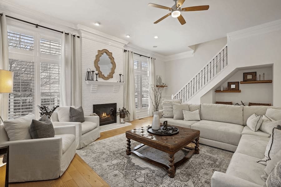 In the family room, we added the 2 white swivel chairs, some of the pillows, mirror over the mantle, round tray on ottoman, the vase and branches all from our staging inventory - the other items were all the homeowners.
